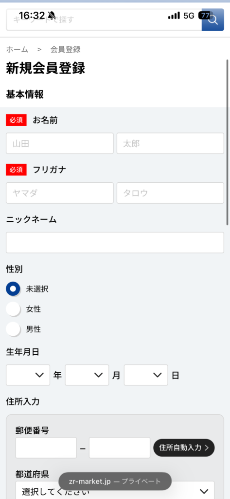 認証コードの入力後、基本情報の入力を行います。