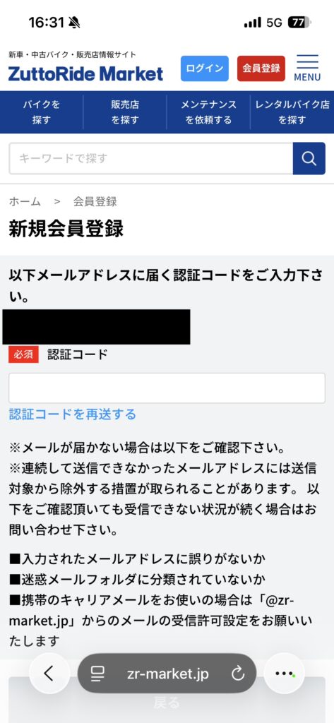 先ほど入力したメールアドレスに認証コードが届きます。確認して入力してください。
