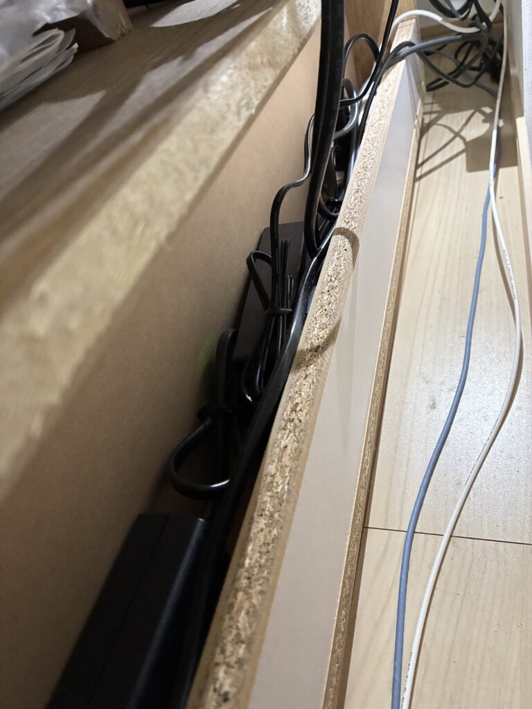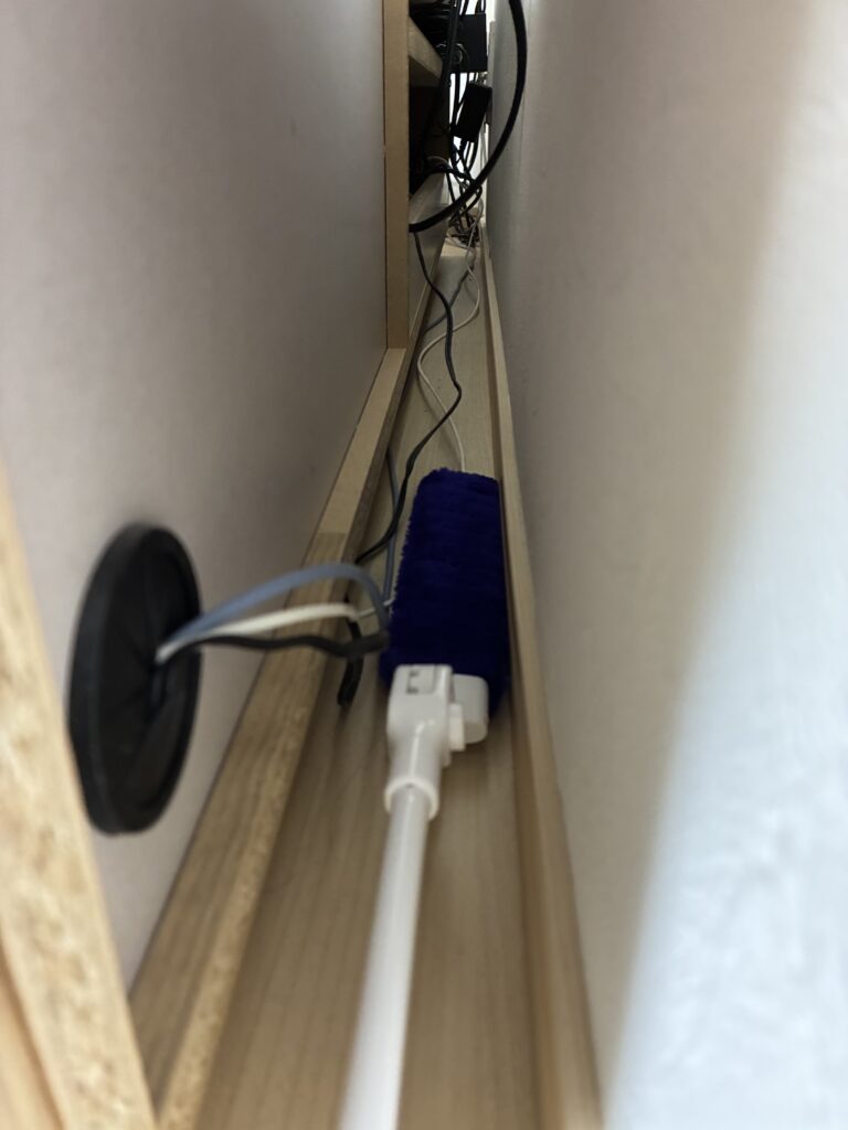 延長コードや動線などをコード収納に入れています。動線は束ねすぎると熱を持つことがあるので束ねすぎには注意してください。